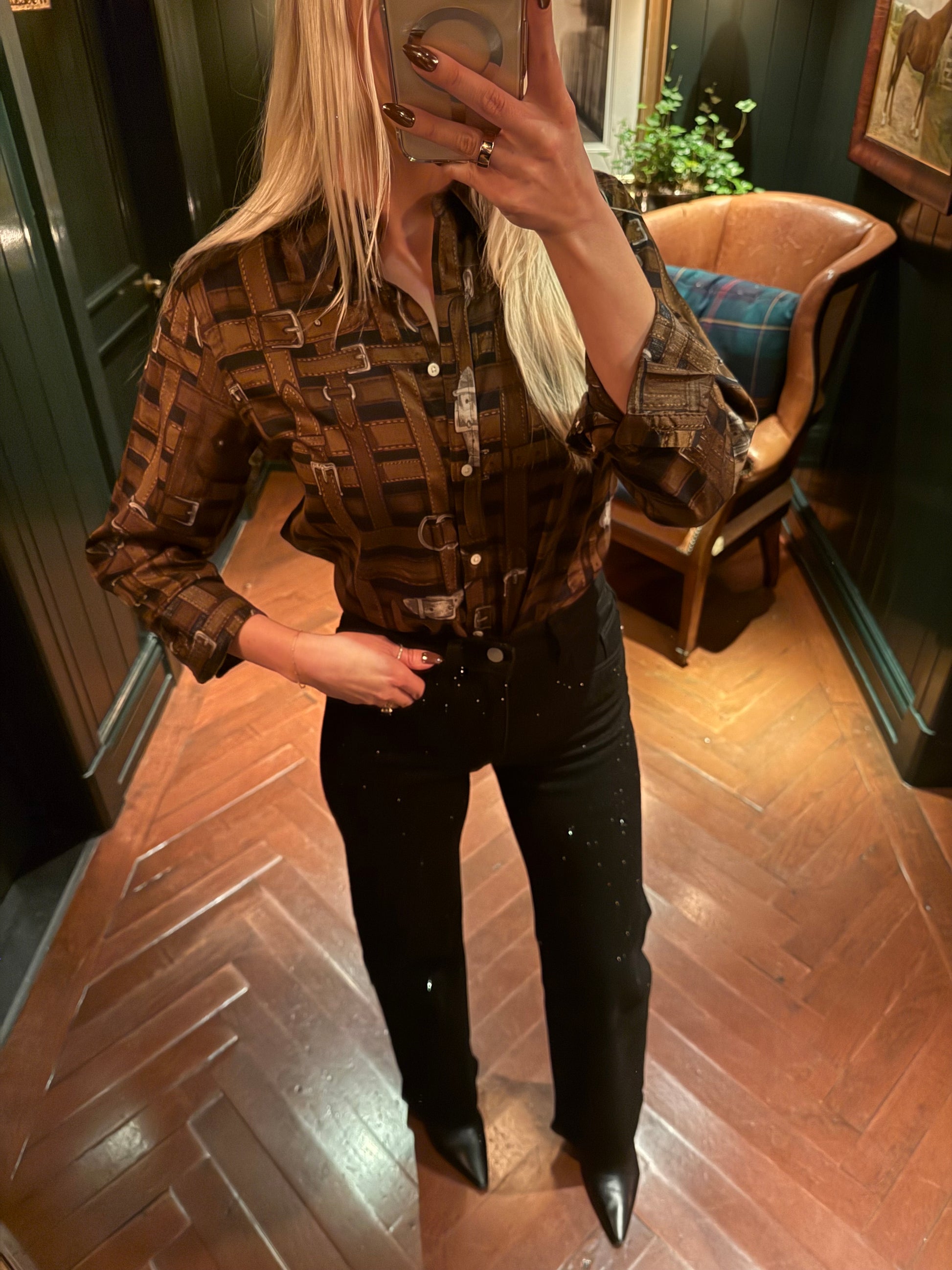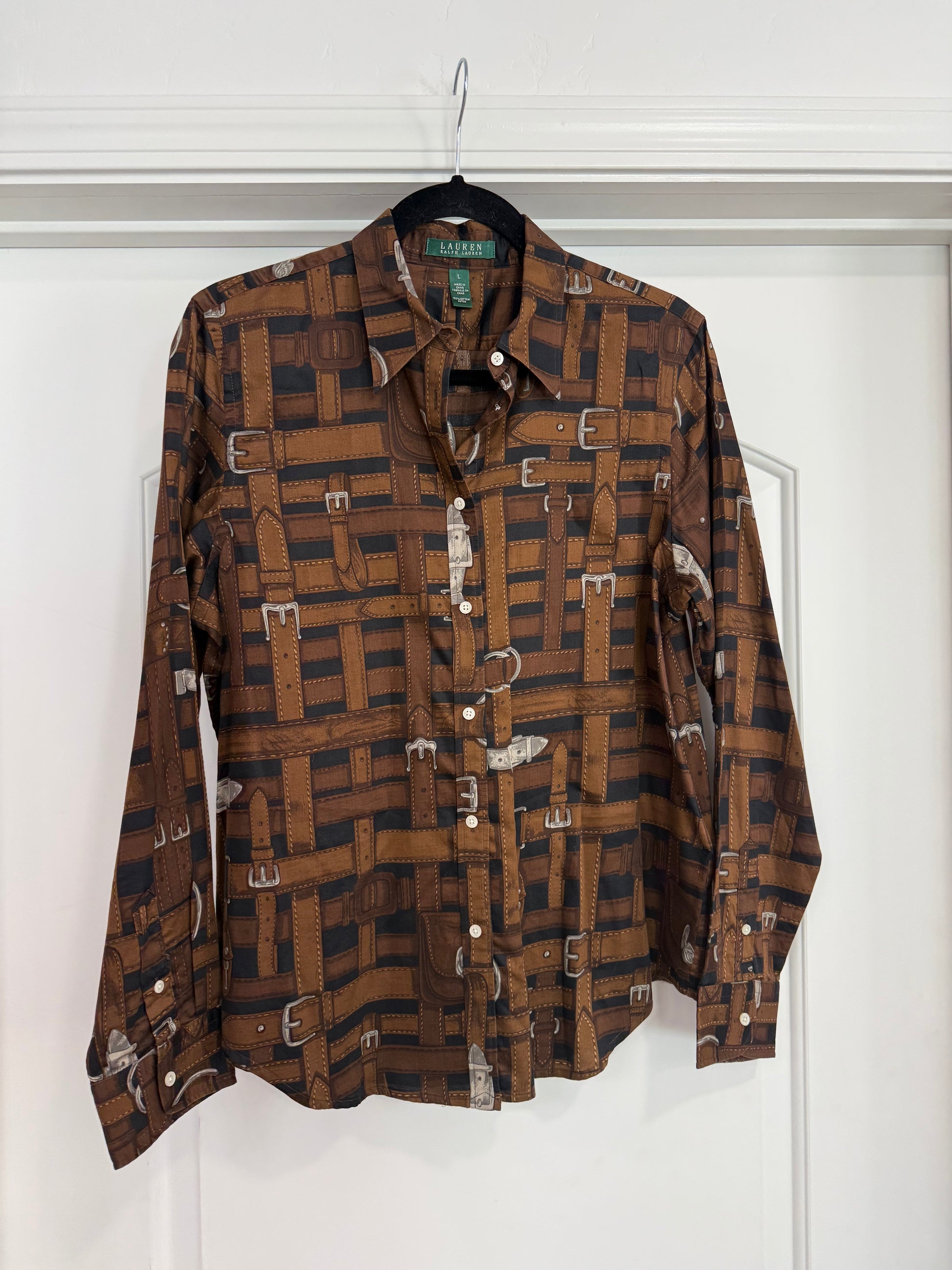 Score a fashion home-run with this Vintage Ralph Lauren Belt Print Equestrian Print Button Down shirt!