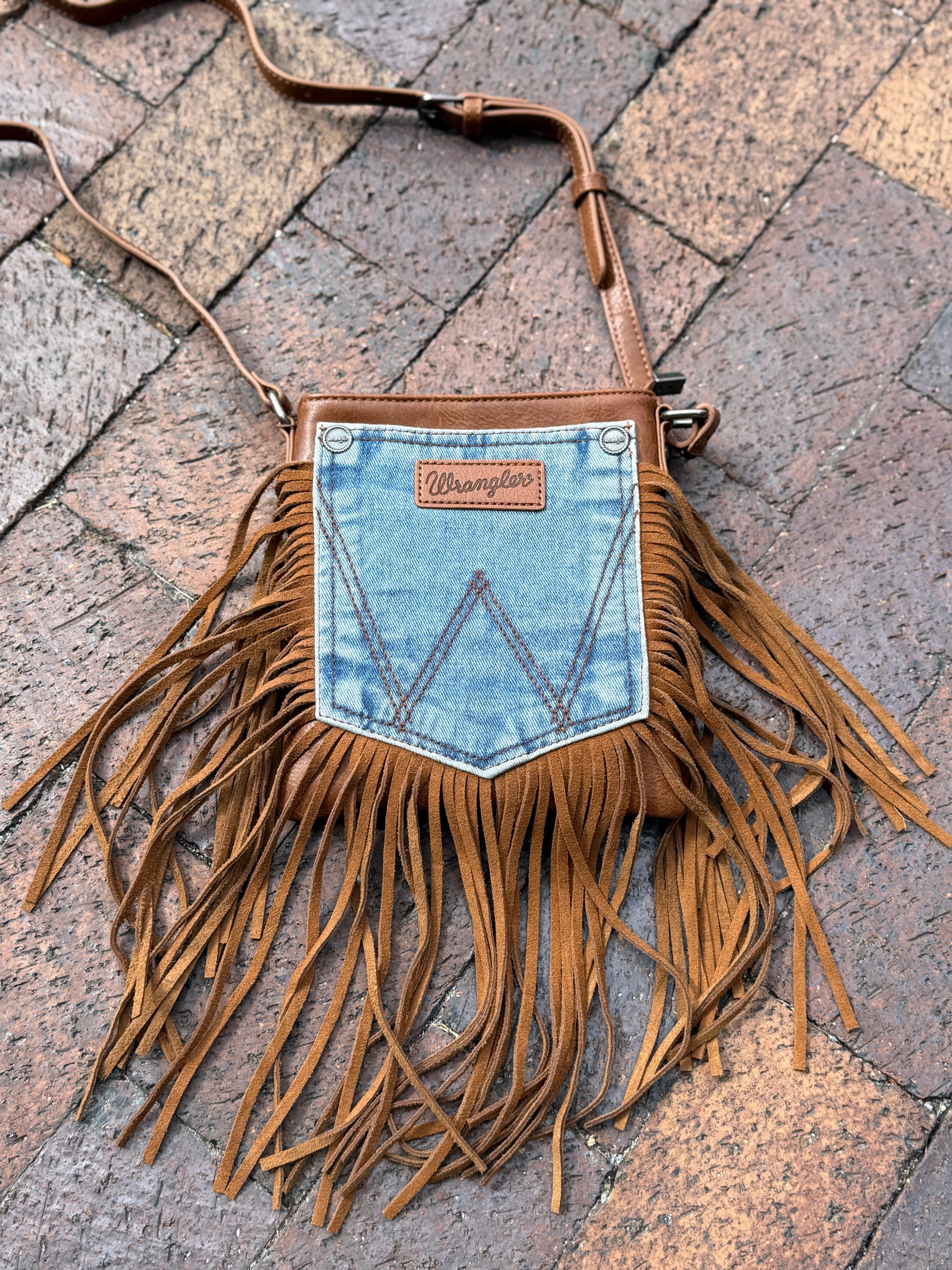 Add a touch of fun to your western look with the new Wrangler Pocket Fringe Purse. Featuring the iconic Wrangler jean pocket design and playful leather fringe, this purse is perfect for carrying essentials while dancing at country concerts or exploring outdoor events. Lightweight and stylish, it pairs perfectly with your favorite boots and denim for a laid-back, music-ready vibe.