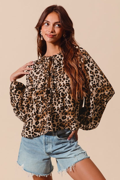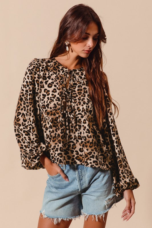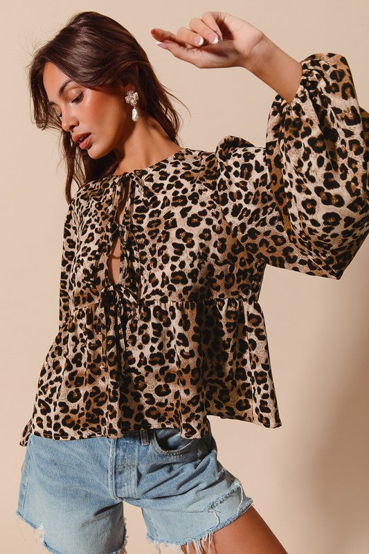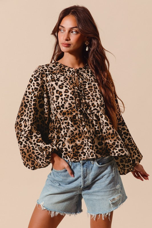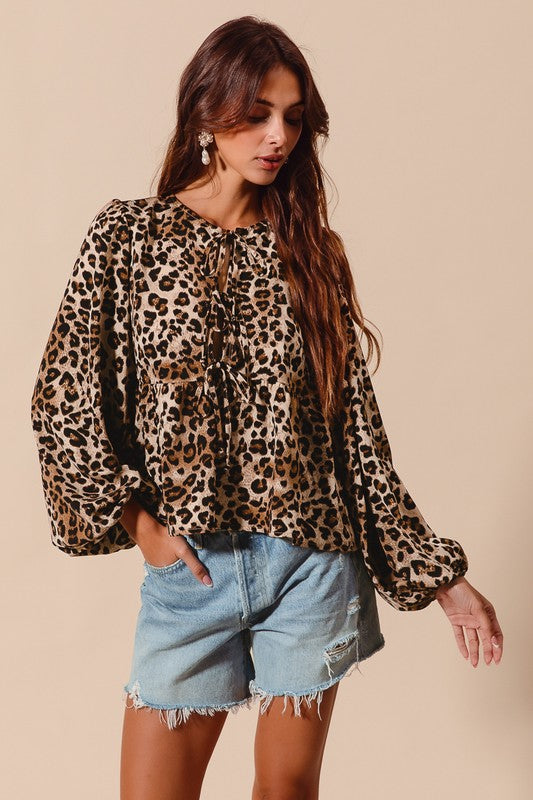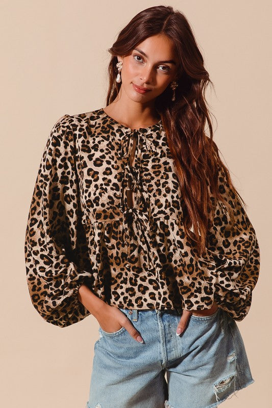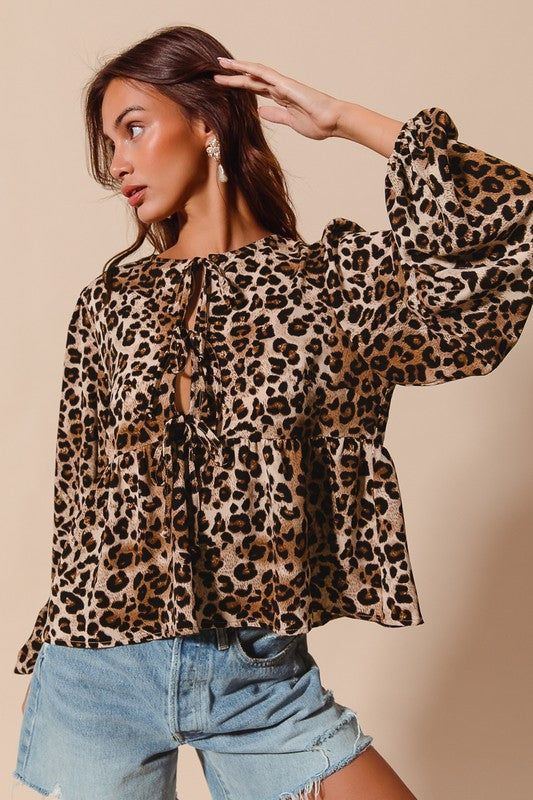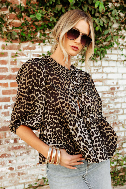 Our new Camille Leopard Top is the top of fall! The tie front design adds a playful touch to the fierce leopard print, perfect for pairing with jeans or leather pants for a girls night out. Shirt has a 3/4 length sleeve.