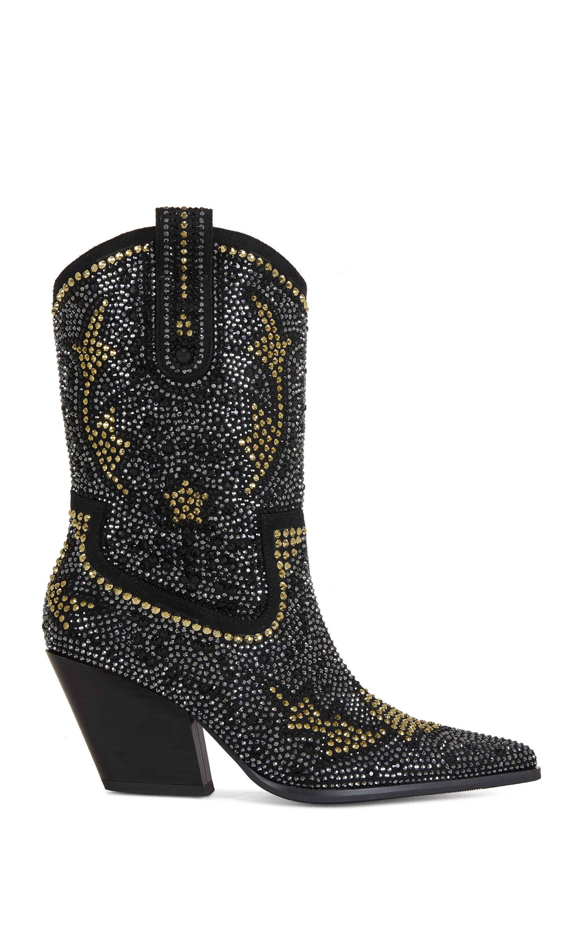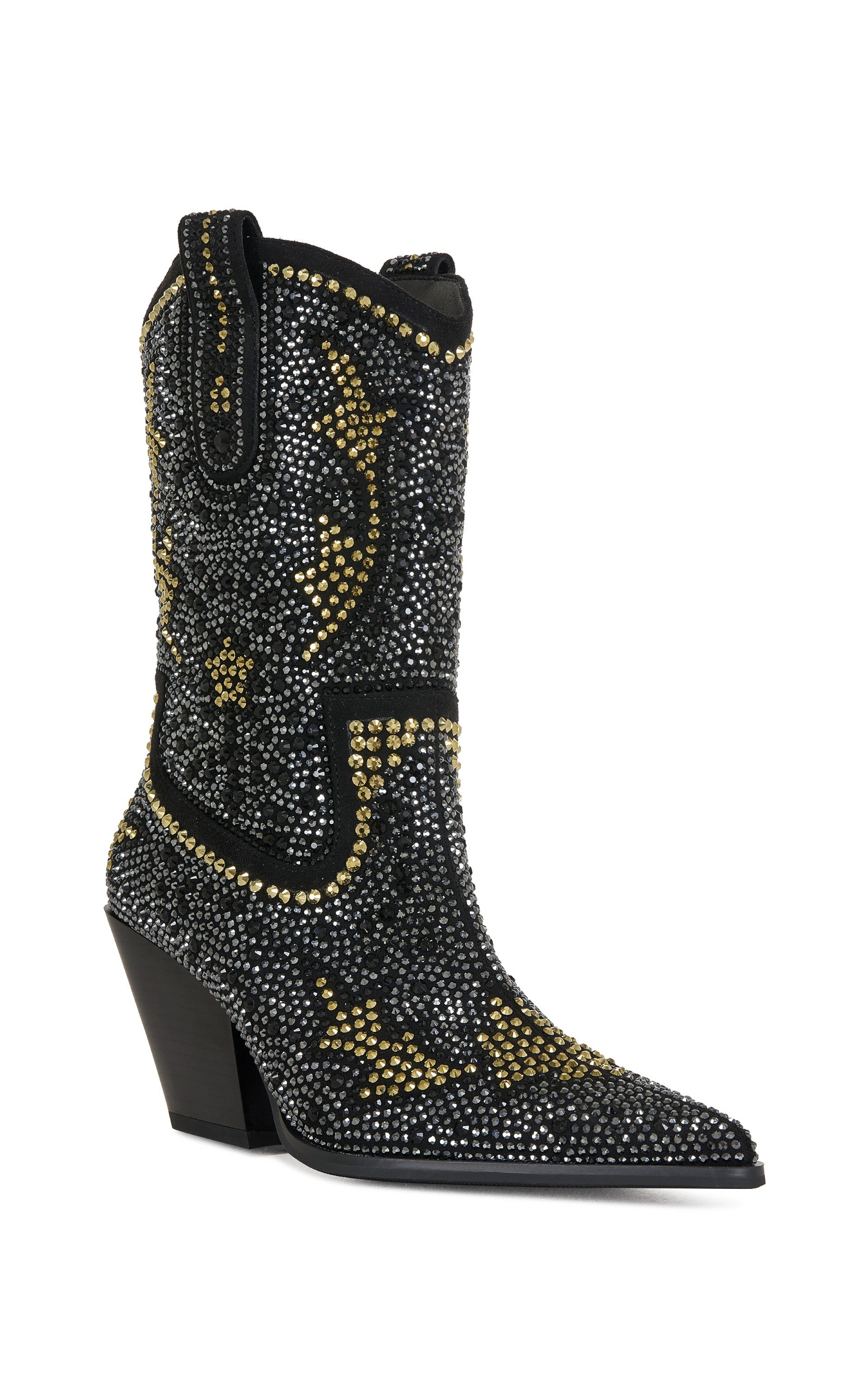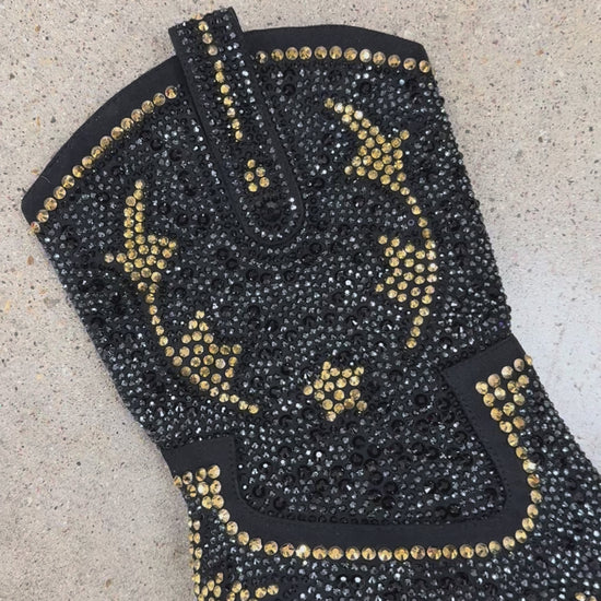 Step out in style with the Lainey Rhinestone Western Bootie, crafted with shimmering black and gold crystal rhinestones, its block heel offers a touch of sophistication, making this bootie the perfect choice for any occasion or concert. Step out in confidence with this gorgeous statement cowboy boot!