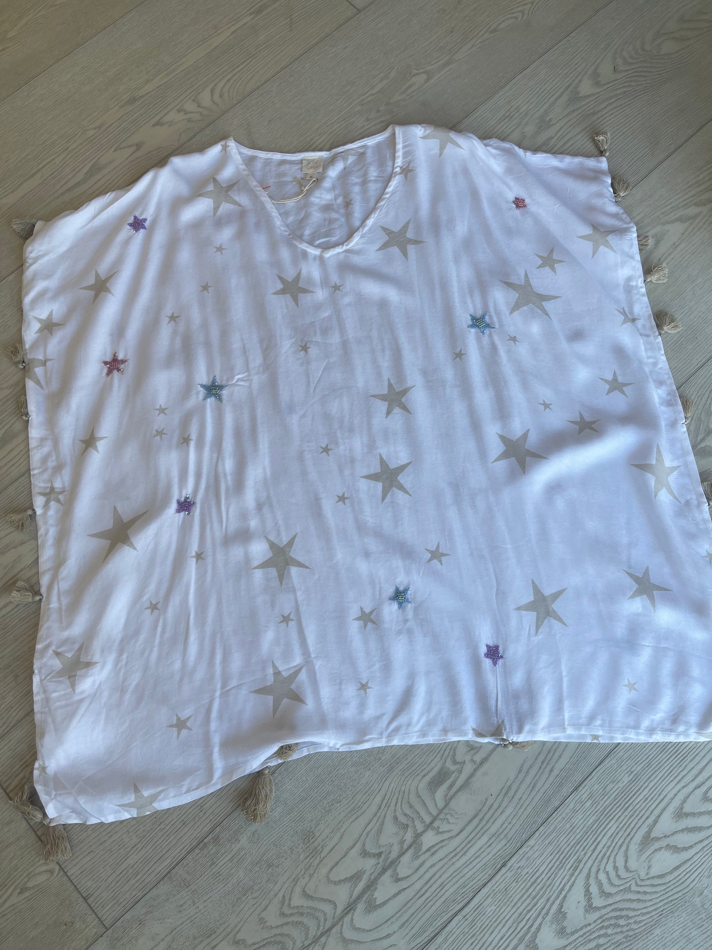 How cute is this coverup?! Star details, tassles throughout, lightweight and perfect for the summer!